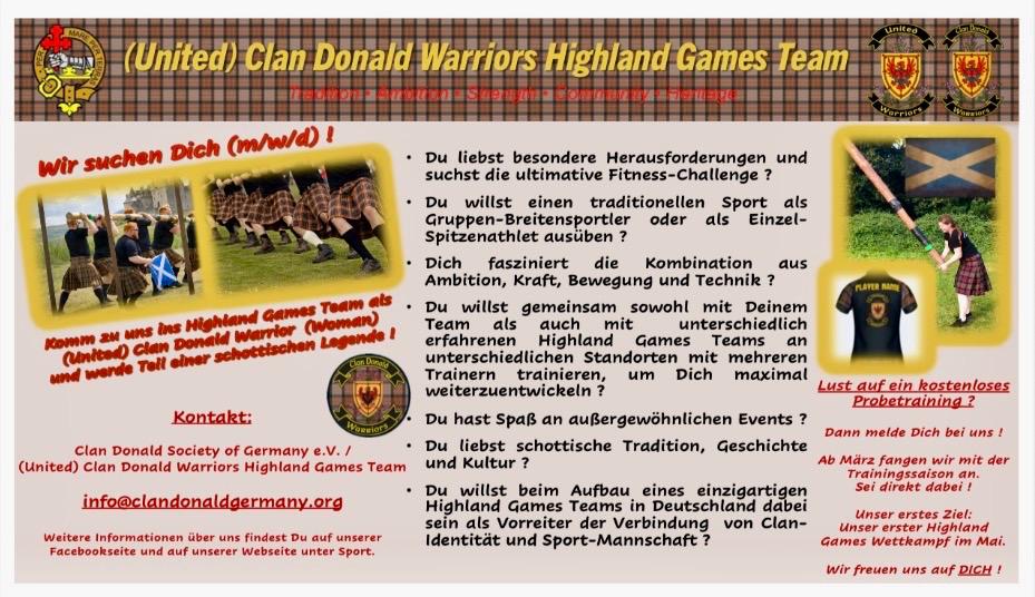 Nun ist es an der Zeit, nach den positiven Saison-Erfahrungen des gemeinsamen Aufbaus des supportetem Highland Games Teams „Warriors of the Castle“ in Kooperation mit Scots on the Castle und mit dem Wissen des internationalen Clan Donald in ein eigenes deutsches Highland Games Team zu investieren. Nachdem sämtliche Formalitäten wie die Mitgliedschaften in den entsprechenden lokalen und Fachsportverbänden abgeschlossen sind, freuen wir uns auf den Aufbau und unsere erste eigene Saison 2026. Auch hier will der Clan Donald zukünftig neue Wege gehen, um ein einzigartiges, langfristiges Projekt in Deutschland zu implementieren: Ein Nachwuchs- und Spitzensport-Leistungszentrum neben dem Breitensport. Den ersten Schritt dazu gehen wir jetzt: Die Gründung eines claneigenen Highland Games Teams und eines übergreifenden Kooperationsteams: